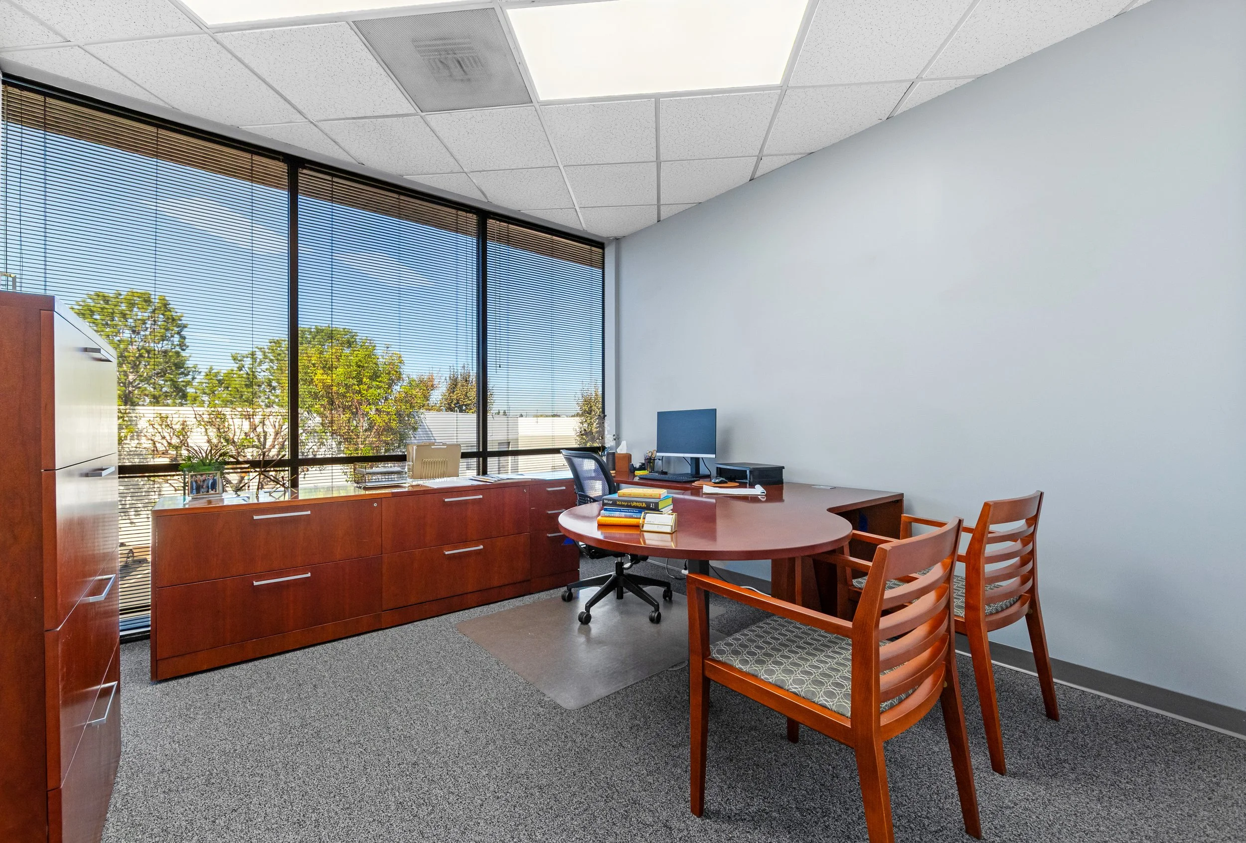 Fully-furnished workspaces with quality wood desks and file cabinets.